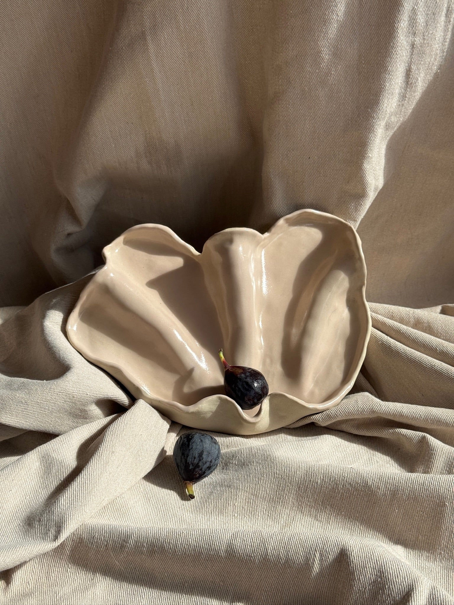 A seashell brought to life in clay, this handmade dish captures the ridges and curves of the ocean. Glazed in a light pink colour, this dish is perfect for serving small bites, holding jewelry or displayed as an art piece.